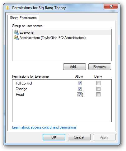 - Il s'applique à tous les fichiers et dossiers de la ressource partagée. Si vous souhaitez fournir une sorte de schéma de restriction plus granulaire, vous devez utiliser l'autorisation NTFS en plus des autorisations partagées.
