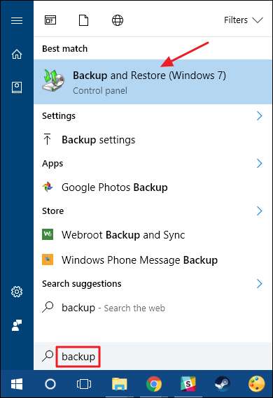 Vous pouvez trouver l'outil en appuyant sur Démarrer, en tapant «sauvegarde», puis en sélectionnant «Sauvegarder et restaurer (Windows 7)».
