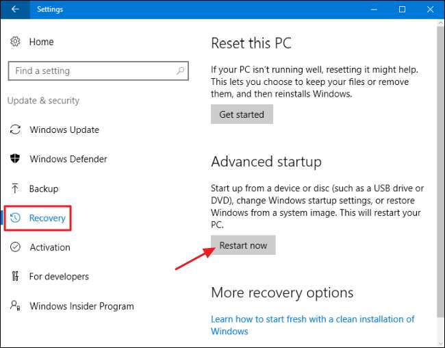 Sous Windows 8 et 10, le options de démarrage avancées fonctionnent un peu différemment, mais ils sont toujours là. Si Windows ne peut pas se charger normalement, vous verrez automatiquement ces options de démarrage. Pour y accéder autrement, allez dans Paramètres> Mise à jour et sécurité> Récupération> Démarrage avancé et cliquez sur «Redémarrer maintenant». Vous pouvez également maintenir la touche Maj enfoncée lorsque vous cliquez sur Redémarrer dans le menu Démarrer.