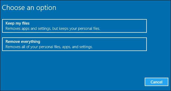 Notez que Windows 8 avait des options distinctes «Actualiser votre PC» et «Réinitialiser votre PC». L'actualisation a conservé tous vos fichiers et paramètres de personnalisation, mais a défini les paramètres par défaut de votre PC et a désinstallé vos applications de bureau. La réinitialisation a tout supprimé, y compris vos fichiers, par exemple une réinstallation complète de Windows à partir de zéro. Windows 10 simplifie les choses en ne disposant que de l'option de réinitialisation, mais en vous permettant de décider de conserver ou non vos fichiers personnels pendant le processus de réinitialisation.