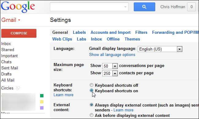 Pour activer les raccourcis clavier, ouvrez la page des paramètres de Gmail à partir du menu d'engrenage.