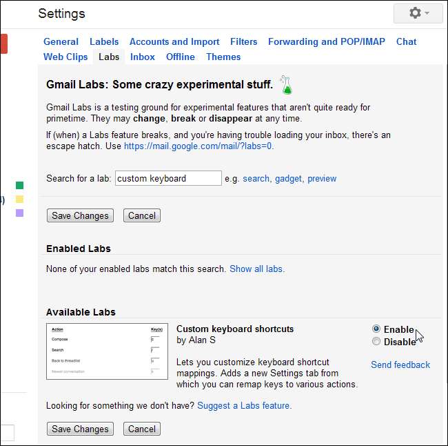 Vous trouverez l'atelier sur les raccourcis clavier personnalisés dans l'onglet Labos des paramètres de Gmail. Activez le laboratoire et cliquez sur le bouton Enregistrer les modifications pour l'activer.
