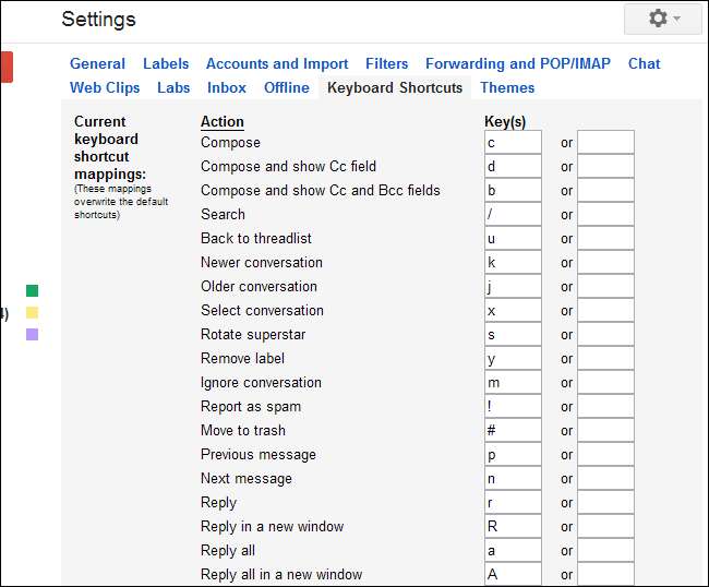 Le laboratoire ajoute un nouvel onglet à la page Paramètres de Gmail. Dans l'onglet, vous pouvez définir des touches de raccourci alternatives pour les fonctions incluses ou modifier les raccourcis clavier par défaut.