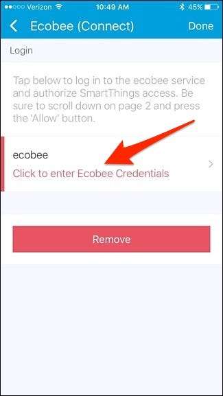 Tapez à l'intérieur de la case où il est dit «Cliquez pour entrer les informations d'identification Ecobee». N'oubliez pas que ce processus peut être différent selon le thermostat intelligent dont vous disposez.