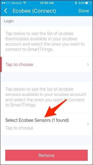 Appuyez sur les capteurs Ecobee3 distants que vous souhaitez ajouter à SmartThings. Dans ce but précis, vous n’avez pas besoin des capteurs à distance, mais si vous prévoyez d’utiliser l’intégration SmartThings à l’avenir pour plus de choses, cela pourrait être utile.