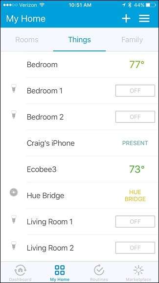 Votre thermostat Ecobee3 et son capteur à distance apparaîtront dans la liste des autres appareils que vous avez connectés à SmartThings.
