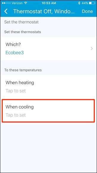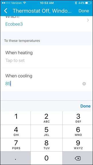 Entrez un nombre élevé, comme 85, pour éteindre le climatiseur et l'empêcher de fonctionner. Étant donné que SmartThings ne vous permet pas d'éteindre le thermostat, il s'agit de la meilleure option suivante. Appuyez sur "Terminé" lorsque vous avez terminé.