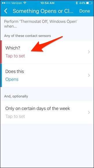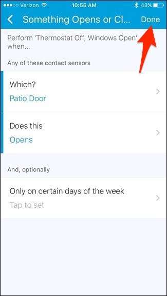 Sélectionnez le capteur que vous souhaitez utiliser pour la tâche d'automatisation. J'utilise notre capteur de porte patio, car c'est généralement ce que nous ouvrons lorsque nous voulons laisser entrer l'air frais de l'extérieur. Cliquez sur «Terminé» après avoir choisi un capteur. Vous pouvez en choisir plusieurs.