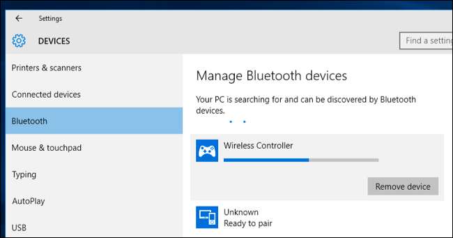 Sous Windows 7, 8 et 10, vous pouvez ouvrir le volet Périphériques et imprimantes dans le Panneau de configuration. Cliquez sur «Ajouter un appareil» et le contrôleur apparaîtra comme un appareil Bluetooth à proximité. Il apparaîtra également dans la liste des appareils connectés ici en tant que «contrôleur sans fil» une fois qu'il sera connecté.