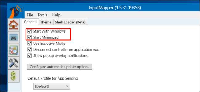 L'émulation xinput ne fonctionne que lorsque InputMapper est ouvert, vous devrez donc laisser ce programme ouvert lorsque vous jouez à des jeux. Cependant, si vous cliquez sur l'icône «Paramètres» sur le côté gauche du programme, vous pouvez lui indiquer «Démarrer avec Windows» et «Démarrer réduit». Il démarre ensuite lorsque vous démarrez votre PC et s’exécute en arrière-plan, vous serez donc toujours prêt à partir.