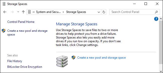 Vous pouvez créer un espace de stockage à partir du panneau de configuration. Tout d'abord, connectez les lecteurs que vous souhaitez regrouper à votre ordinateur. Ensuite, dirigez-vous vers Panneau de configuration> Système et sécurité> Espaces de stockage. Vous pouvez également rechercher simplement «Espaces de stockage» dans votre menu Démarrer.