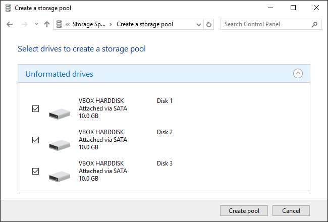 Sélectionnez les lecteurs que vous souhaitez ajouter au pool et cliquez sur «Créer un pool» pour créer un pool de stockage à partir de ces lecteurs.