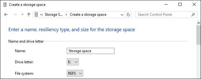 Après avoir créé un pool, vous serez invité à configurer votre nouvel espace de stockage. Tapez un nom pour l'espace de stockage et sélectionnez une lettre de lecteur. L'espace de stockage apparaîtra avec ce nom et cette lettre de lecteur dans Windows.
