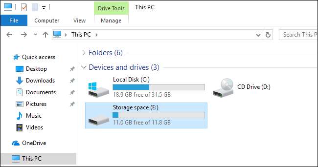 L'espace de stockage que vous avez créé apparaîtra en tant que lecteur standard sous Ce PC, avec le nom et la lettre de lecteur que vous avez configurés. Il ne semble pas différent d'un lecteur physique normal de Windows et des programmes de bureau que vous utilisez.