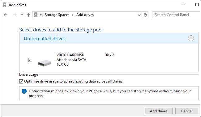 Si vous n'avez pas sélectionné cette option lors de l'ajout d'un lecteur, vous pouvez ensuite cliquer sur "Optimiser l'utilisation du lecteur". L'option «Optimiser l'utilisation du lecteur» est nouvelle dans Windows 10. Vous devez également exécuter l'option «Optimiser l'utilisation du lecteur» après la mise à niveau d'un pool créé à l'origine sous Windows 8.