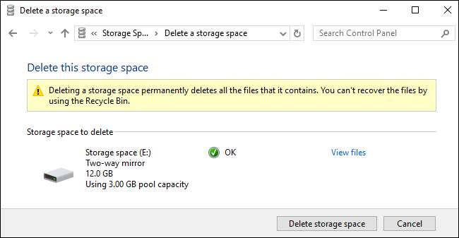 Vous pouvez également choisir de supprimer un espace de stockage ou un pool de stockage à partir d'ici en cliquant sur «Supprimer» à droite de l'espace de stockage.