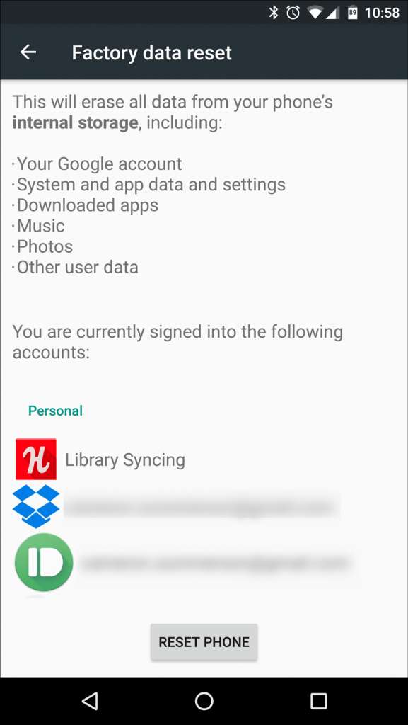 Vous verrez un avertissement ici pour vous informer que ce processus effacera toutes les données de la mémoire interne du téléphone. Appuyez sur le bouton «Réinitialiser le téléphone», qui vous invitera à saisir votre code PIN de sécurité, votre mot de passe ou votre schéma s'il est activé.