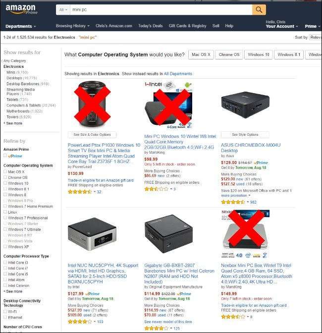 Ce que je ne savais pas à l'époque, c'est que trois des six premiers résultats de recherche pour «mini PC» sur Amazon sont fournis avec des licences Windows piratées. (Les trois autres résultats sont une Chromebox et deux PC barebones sans licence Windows.)