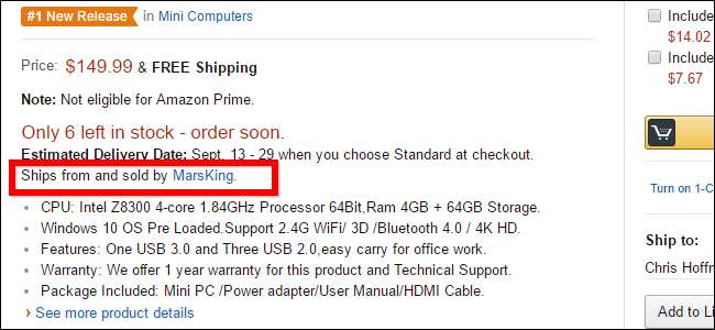 Le PC que j'ai acheté a été vendu par " MarsKing «. Bien sûr, c’est un fabricant chinois dont je n’ai jamais entendu parler, mais c’est un solide matériel Intel à l’intérieur. Il a également été marqué par Amazon comme la «nouvelle version n ° 1» dans cette catégorie et avait de solides critiques de 4 à 5 étoiles à l'époque. Il avait même un logo «Prime», ce qui signifiait qu'il me serait expédié depuis un entrepôt Amazon.