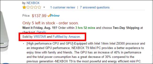 La plupart des gens ne s'en rendent pas compte, mais Amazon ne vend pas réellement la plupart des produits sur Amazon.com. Au lieu de cela, la plupart des produits vendus sur Amazon.com proviennent en fait de «vendeurs tiers». Amazon fonctionne simplement comme un marché, vous connectant et le vendeur. Même si un produit est marqué comme «Prime» et provient du propre entrepôt d'Amazon, il peut simplement être «livré par Amazon»: un vendeur expédie ses produits à l'entrepôt d'Amazon, puis Amazon vous les expédie. Amazon ne vend pas réellement le produit et ne l'a pas vérifié. En 2015, un Rapport RW Baird a constaté que 83% des produits achetés sur Amazon.com étaient vendus par des vendeurs tiers.