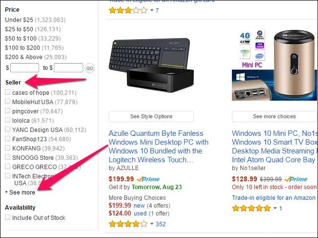 Après avoir recherché un produit sur Amazon, faites défiler vers le bas dans la barre latérale gauche et recherchez la section «Vendeur». Cliquez sur l'option «Voir plus», puis sélectionnez «Amazon.com» pour afficher uniquement les produits vendus par Amazon.