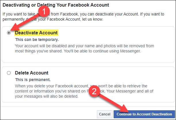 Voici où vous voudrez vous assurer que vous choisissez l'option "Désactiver le compte" plutôt que "Supprimer le compte", puis cliquez sur "Continuer vers la désactivation du compte."