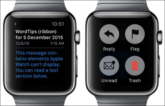 L'application «Mail» sur Apple Watch vous permet non seulement de consulter vos e-mails, mais également de les traiter à l'aide de Force Touch. Lorsque vous ouvrez l'application de messagerie, appuyez sur l'e-mail que vous souhaitez marquer, supprimer, marquer comme non lu ou répondre à .