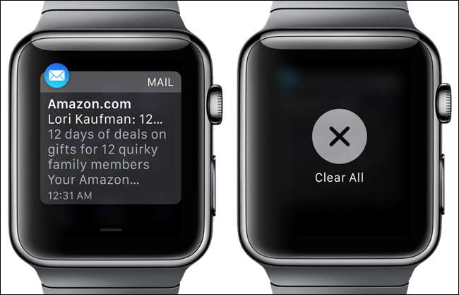 Ceci est pratique si vous recevez de nombreuses notifications à la fois. Plutôt que de rejeter chaque notification distincte, vous pouvez effacer rapidement et facilement toutes les notifications. Lorsque vous recevez des notifications, ouvrez la liste principale des notifications et appuyez fermement sur l'écran de la montre. Appuyez sur le bouton «Effacer tout» pour ignorer ou effacer toutes les notifications.