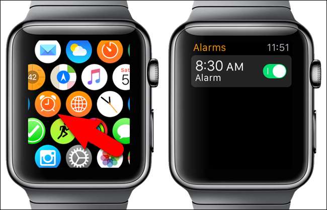 Tout comme les montres multifonctions telles que Casio, votre Apple Watch dispose également d'une fonction d'alarme. Lorsque vous ouvrez l'application «Alarmes», toutes les alarmes que vous avez ajoutées s'affichent dans une liste et les boutons coulissants indiquent si elles sont activées (vertes) ou désactivées (gris). Les alarmes désactivées s'affichent également en texte gris plutôt qu'en blanc.