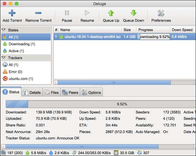 Nous le recommandons toujours sur le Mac, mais nous l'avons déplacé à notre deuxième place, car l'interface de qBittorrent est vraiment moche. Cela ressemble à quelque chose qui appartiendrait à une version beaucoup plus ancienne de macOS. Deluge, bien que n'étant toujours pas une application conçue avec OS X à l'esprit, semble nettement plus élégant.
