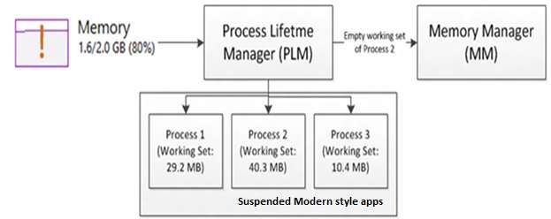«Windows 8 peut écrire efficacement l'ensemble de travail (privé) d'une application moderne suspendue sur le disque afin de gagner de la mémoire supplémentaire lorsque le système détecte une pression. Ce processus est analogue à la mise en veille prolongée d'une application spécifique, puis à sa reprise lorsque l'utilisateur revient à l'application. Dans ce cas, Windows 8 tire parti du mécanisme de suspension / reprise des applications modernes pour vider ou remplir à nouveau l'ensemble de travail d'une application. "