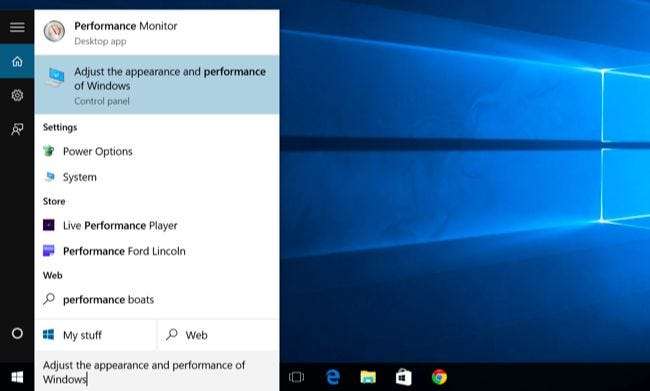 Mais vous pouvez supprimer ce fichier, si vous le souhaitez. Pour accéder à la boîte de dialogue appropriée, ouvrez le menu Démarrer, saisissez «performances» et sélectionnez le raccourci «Ajuster l'apparence et les performances de Windows».