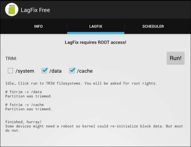 Cependant, cette mise à jour ne fait rien pour corriger les secteurs existants qui auraient dû être TRIMMed dans le passé, mais qui ne l'ont pas été. Pour ce faire vous-même, vous pouvez essayer le LagFix app de Google Play (il nécessite root ). Cette application est une interface pour l'utilitaire fstrim, et elle réduira votre stockage vide, résolvant ce problème.
