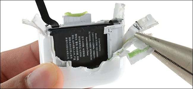 Jetez un œil à Démontage par iFixit d'une paire d'AirPods . Tout est collé et vous ne pouvez même pas retirer la batterie sans détruire l’écouteur. Il en va de même pour le boîtier de charge. Sur leur blog, iFixit dit que «Dans l'ensemble, accéder à n'importe quel composant - y compris les batteries dans le boîtier et dans les 'Pods - est impossible sans une destruction totale."