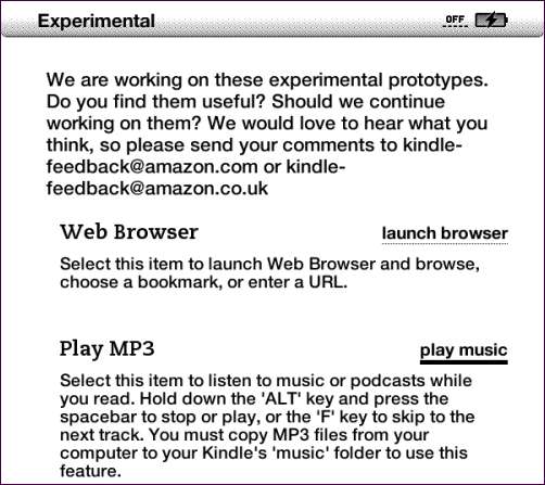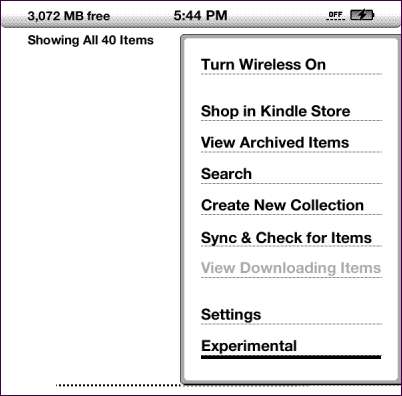 Éjectez (ou retirez en toute sécurité) votre Kindle par la suite. Sur votre Kindle, appuyez sur le bouton Menu de l'écran d'accueil et sélectionnez Expérimental.