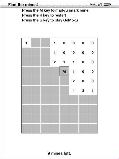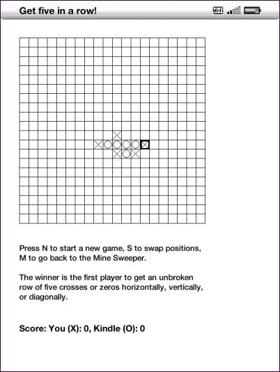Pour accéder à GoMoku, également connu sous le nom de «Cinq d'affilée», appuyez sur la touche G sur l'écran du balayeur de mines. Votre Kindle et vous placez à tour de rôle des X et des O sur un tableau - l'objectif est de placer cinq marques d'affilée avant que votre Kindle ne le fasse!
