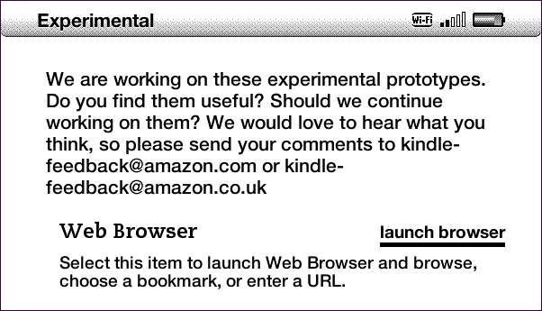 Pour lancer le navigateur du Kindle, appuyez sur le bouton Menu de l’écran d’accueil, sélectionnez Expérimental, puis sélectionnez Lancer le navigateur.