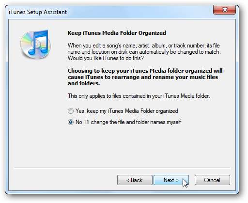 אתה יכול למעשה להפוך את ההתקנה שלך ל- iTunes למהירה יותר על ידי השבתה של כמה דברים תוך כדי מעבר דרך עוזר ההתקנה. אם יש לך הרבה שירים בתיקיית המוסיקה שלי, iTunes תרצה להוסיף את כולם. אם אתה רוצה לצאת לעניינים ולא לחכות בזמן שהוא מחפש בתיקיה כדי להוסיף שירים, בטל את הסימון של שתי האפשרויות.