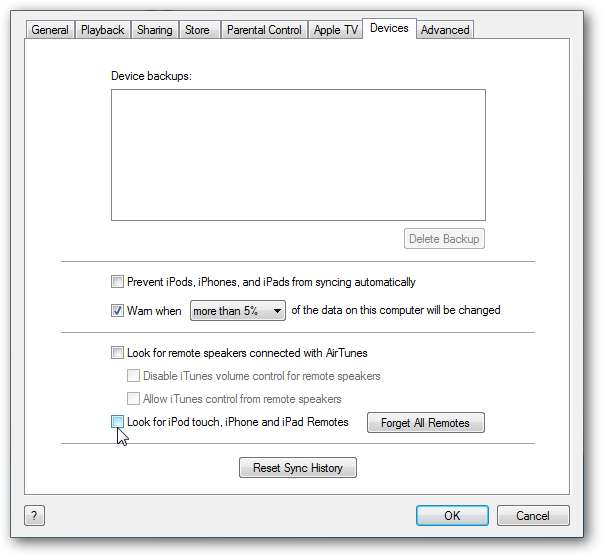 לאחר מכן לחץ על כרטיסיית המכשירים ובטל את הסימון חפש רמקולים מרוחקים המחוברים עם AirTunes ו חפש שלטי iPod touch, iPhone ו- iPad .