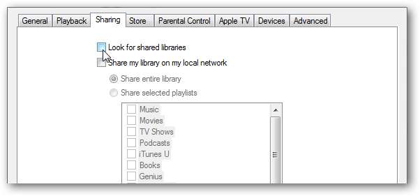אם אתה מפעיל את iTunes במכונה עצמאית, דבר נוסף שתרצה לעשות הוא לעבור לכרטיסייה שיתוף ולבטל את הסימון חפש ספריות משותפות .