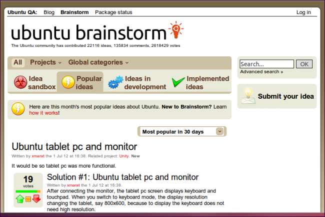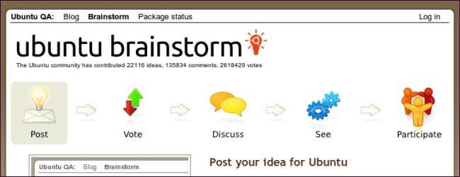 להשתמש ב אתר סיעור מוחות של אובונטו להגיש רעיונות לתכונות, להצביע על רעיונות תכונה אחרים שהוגשו, ולדון בהם. כפי שאומר אתר סיעור המוחות של אובונטו, "סיעור מוחות של אובונטו נקרא באופן קבוע על ידי מפתחי ותורמים של אובונטו." אם יש לך יכולת תכנות, אתה יכול לבחור תכונה וליצור קשר עם צוות אובונטו הרלוונטי כדי להתחיל.