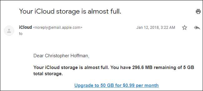 כשאתה מתקרב לאחסון של 5 GB, ה- iPhone שלך (או iPad) יתחיל לנדנד לך לשלם. אפל אפילו תשלח לך אימייל בבקשה לקבל יותר כסף.
