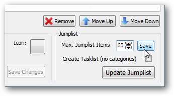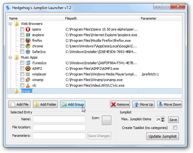 לאחר ההשקה, מוצג בפניך מסך שיח תצורה כדי להתחיל בהגדרת רשימות הקפיצה שלך. אתה יכול ליצור קבוצות שונות ולתת להם שם בהתאם לצרכים שלך. אתה יכול לדפדף לספריות התוכניות והקבצים, אך הדרך הקלה ביותר שמצאתי היא גרירת קיצורי דרך אל ה- Jumplist Launcher.