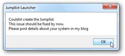 לעיתים יש שגיאות בעת הוספת פריטים ל- Jumplist, אך נראה שהבעיה מתקינה את עצמה מייד, אז פשוט לחץ על אישור לתיבת הדו-שיח. אם אתה מקבל שגיאות או מוצא באגים, מומלץ לפרסם אותם אצל המפתחים בלוג .