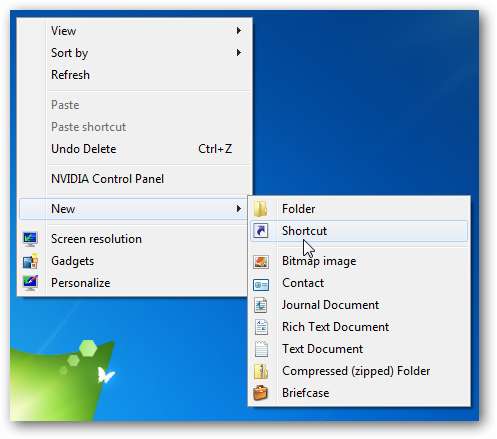 לחץ באמצעות לחצן העכבר הימני על אזור ריק בשולחן העבודה שלך ובחר קיצור דרך חדש \.