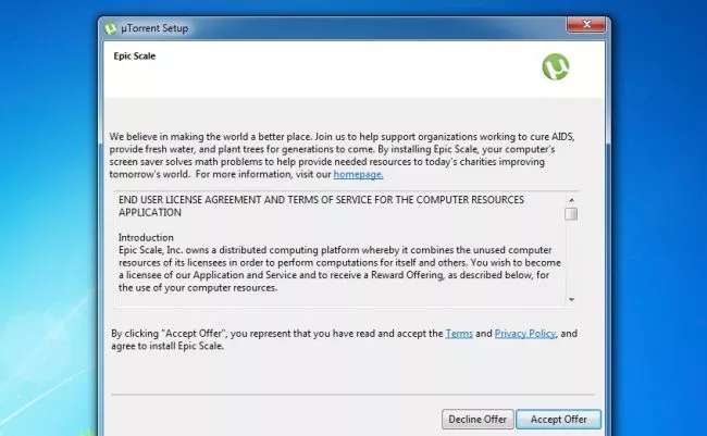 BitTorrent טוען כי Epic Scale מוצדק לחלוטין בהתעללות בחומרה שלך מכיוון שהסכמת לכך. אם לחצתם דרך המתקין של uTorrent והסכמתם בטעות להצעה של Epic Scale מכיוון שזה היה מוסווה להיראות כמו מסך רישיון לגיטימי, זו רק אשמתכם לבחירת השימוש ב- Epic Scale. זה הטיעון של BitTorrent, Inc. אם אתה לא אוהד של זה, נסה אחת מהחלופות האלה של uTorrent (או הישאר עם גרסה ישנה יותר של uTorrent) ולשלוח הודעה. כבונוס, אתה יכול להימנע מכל הזבל שהם ינסו להחליק למחשב שלך בעתיד.