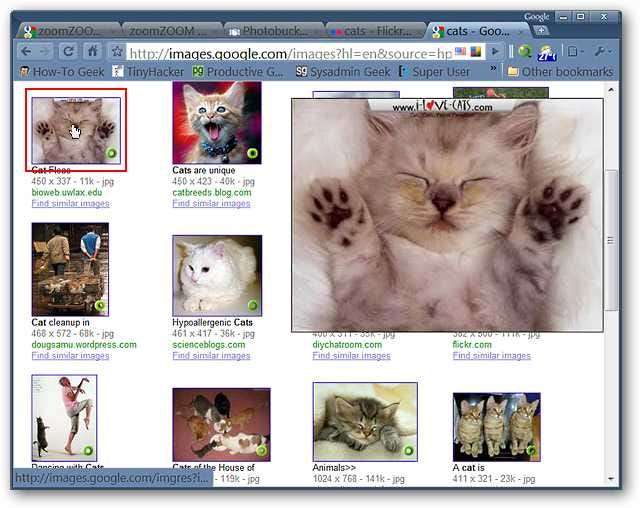 החלטנו לנסות שלושה מתוך ששת האתרים הזמינים כיום למאמר שלנו. התחלנו ב- "Photobucket" בחיפוש אחר "חתולים" ... תמונות ממוזערות יכולות להיות טובות אך תמונות גדולות יותר טובות.