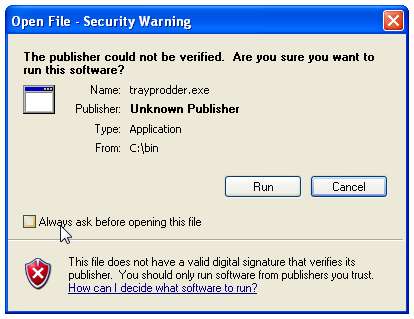 בפעם הראשונה שתפעיל את קיצור הדרך תתבקש לקבל אזהרת אבטחה, שאותה תוכל להסיר על ידי ביטול הסימון של "שאל תמיד לפני שתפתח את הקובץ הזה".