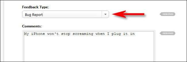 אם באג קורה שוב ושוב במכשיר שלך, זה כנראה שווה דיווח, כך שזה יכול להיות קבוע בעתיד. אתה יכול לדווח על באג iPhone כדי Apple באמצעות זה טופס משוב באתר של אפל . בעת מילוי הטופס, בחר "באג דוח" בתפריט "סוג משוב" בתפריט.