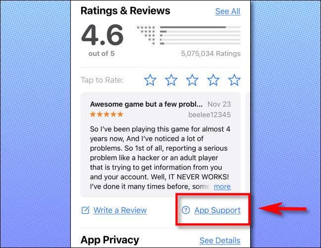 אם אתה נתקל בבעיות עם אפליקציית צד שלישי, פתח את חנות האפליקציות ונווט אל הדף של הבעיה. גלול מטה, ומתחת לציון הסקירה, הקש על "תמיכה App".